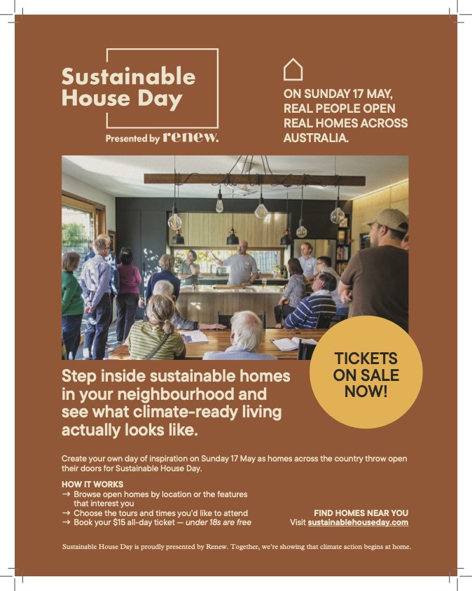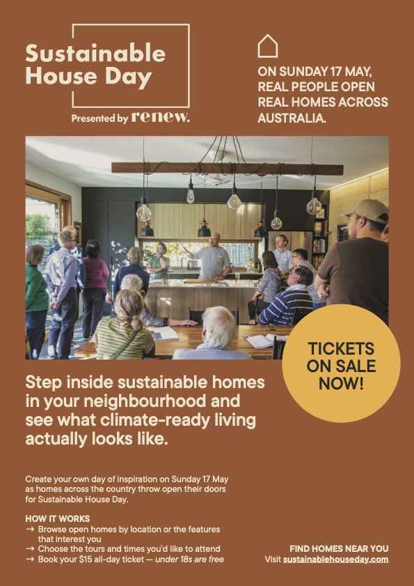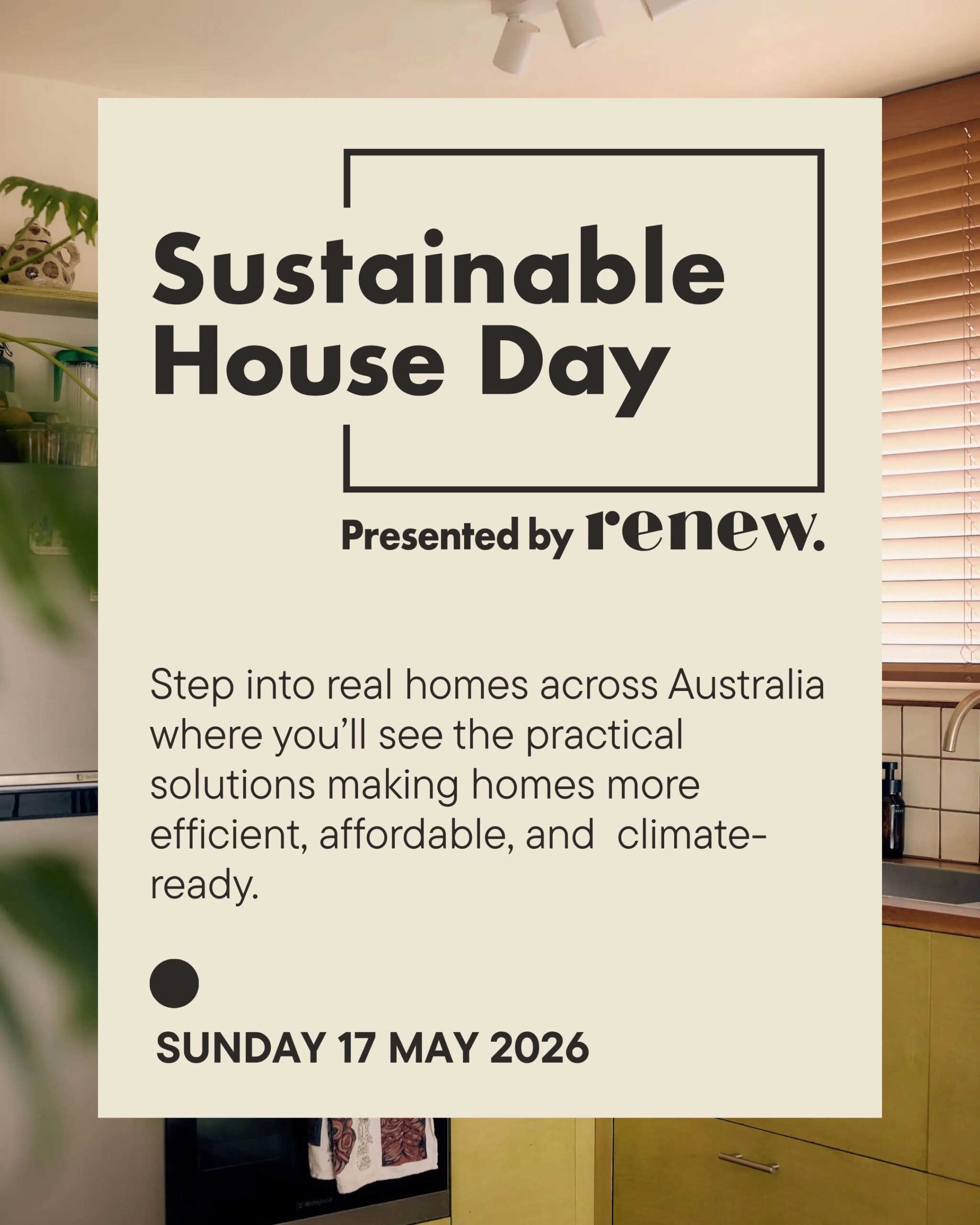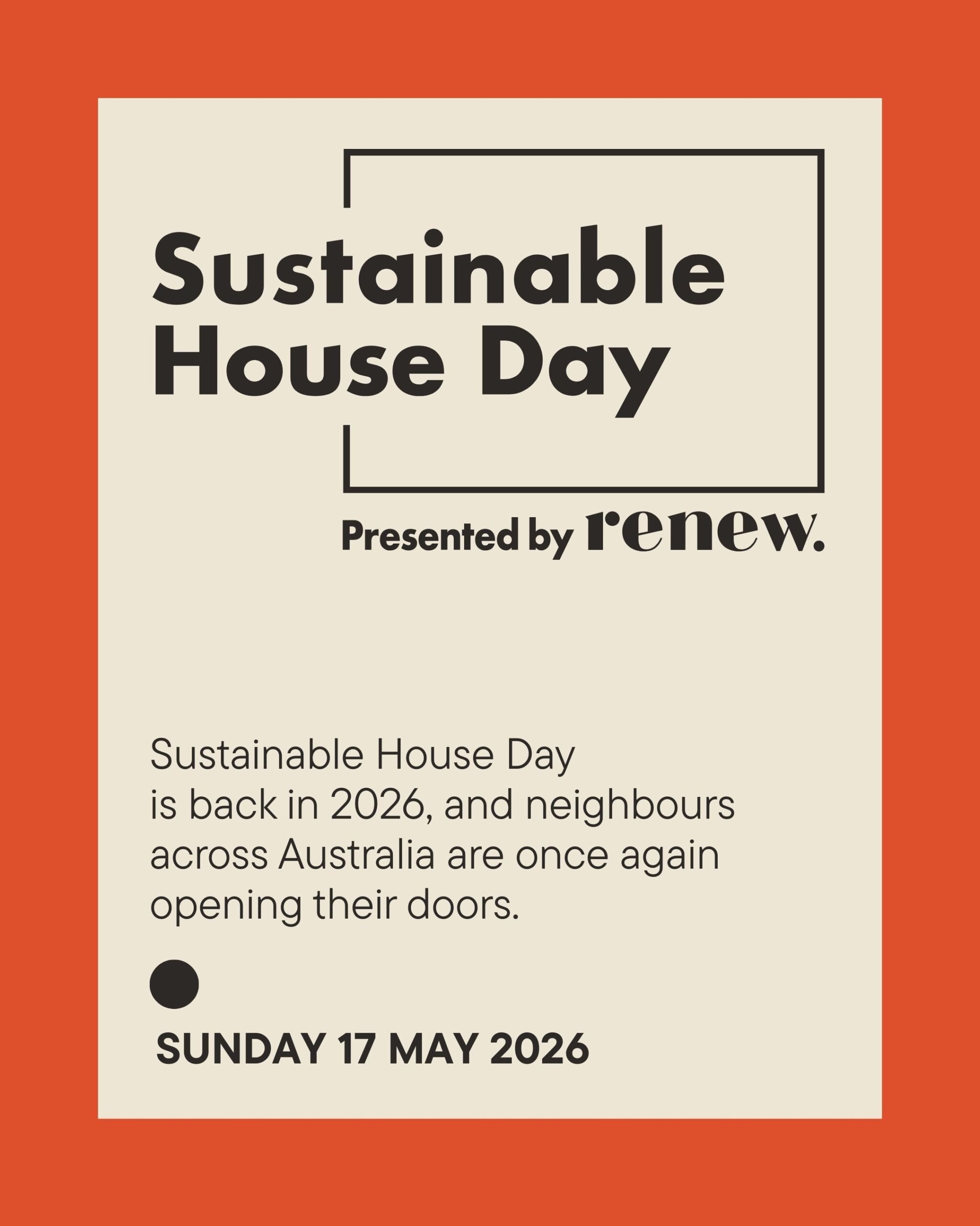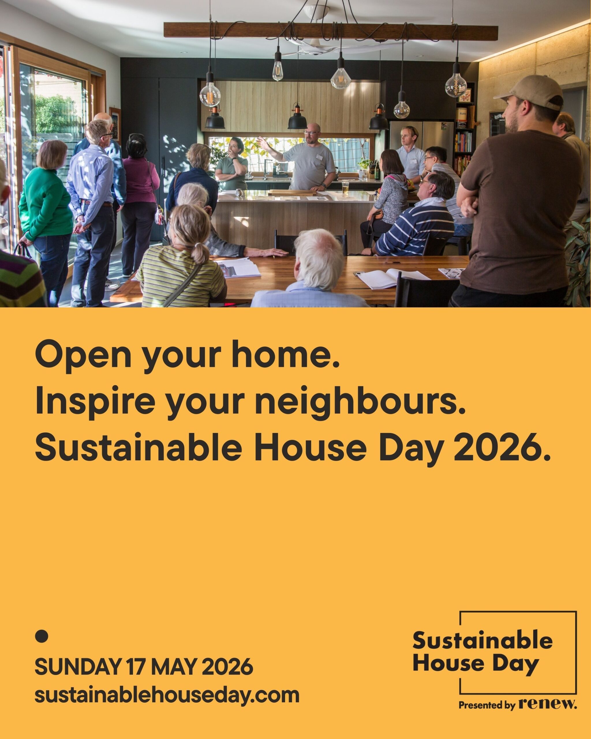 Presented by Renew, Sustainable House Day is one of Australia’s most trusted, community-led sustainability events. Each year, homeowners and renters across the country open their doors to share practical, lived experience of building, retrofitting and living in homes that are more efficient, affordable and climate-ready.