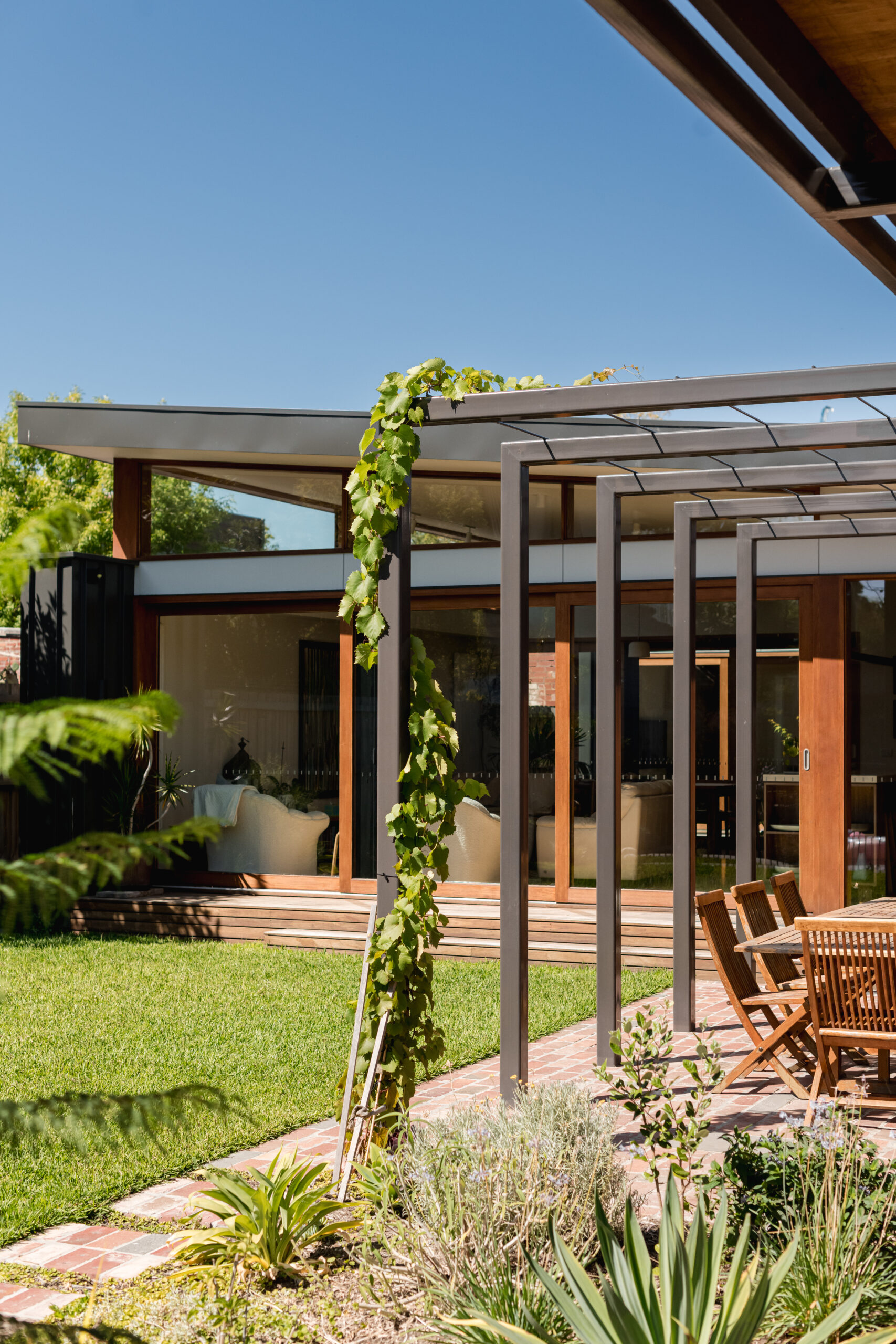 This new house in Brunswick feels far removed from its urban surroundings. Although it is within walking distance of central Melbourne, the home sits deep on its block and is surrounded by garden. It provides a peaceful retreat for the young family who live there, offering a calm escape from the busyness of city life.