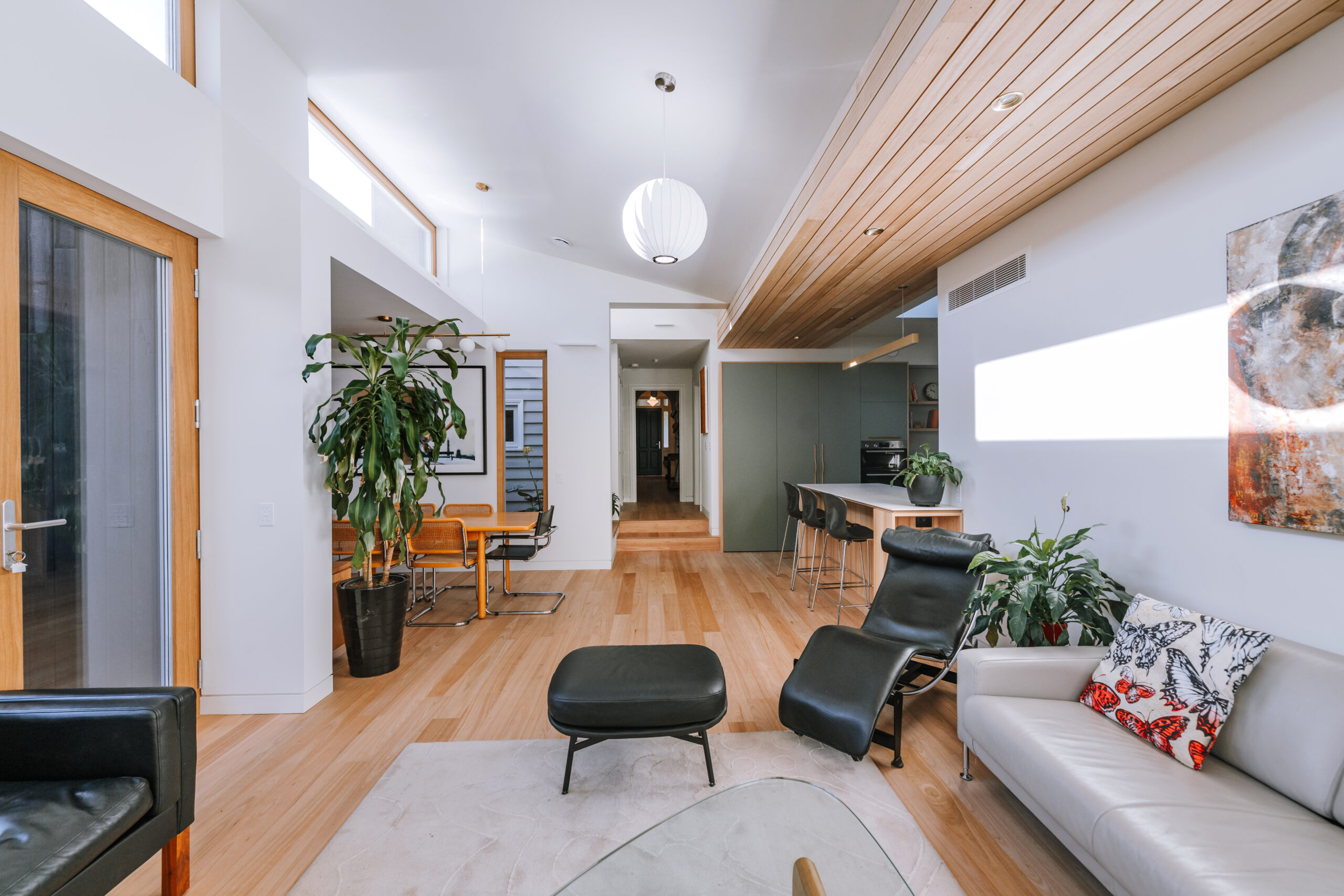 Timber/alu windows are triple glazed with openable clerestory windows for night purging. Living areas are designed to capture winter sun and exclude summer sun. Natural light has been maximised and all rooms have access to nature. A mature Silver Birch has been saved to shade the west elevation and an existing green wall on the north boundary has been salvaged to enhance the views from the north facing windows.