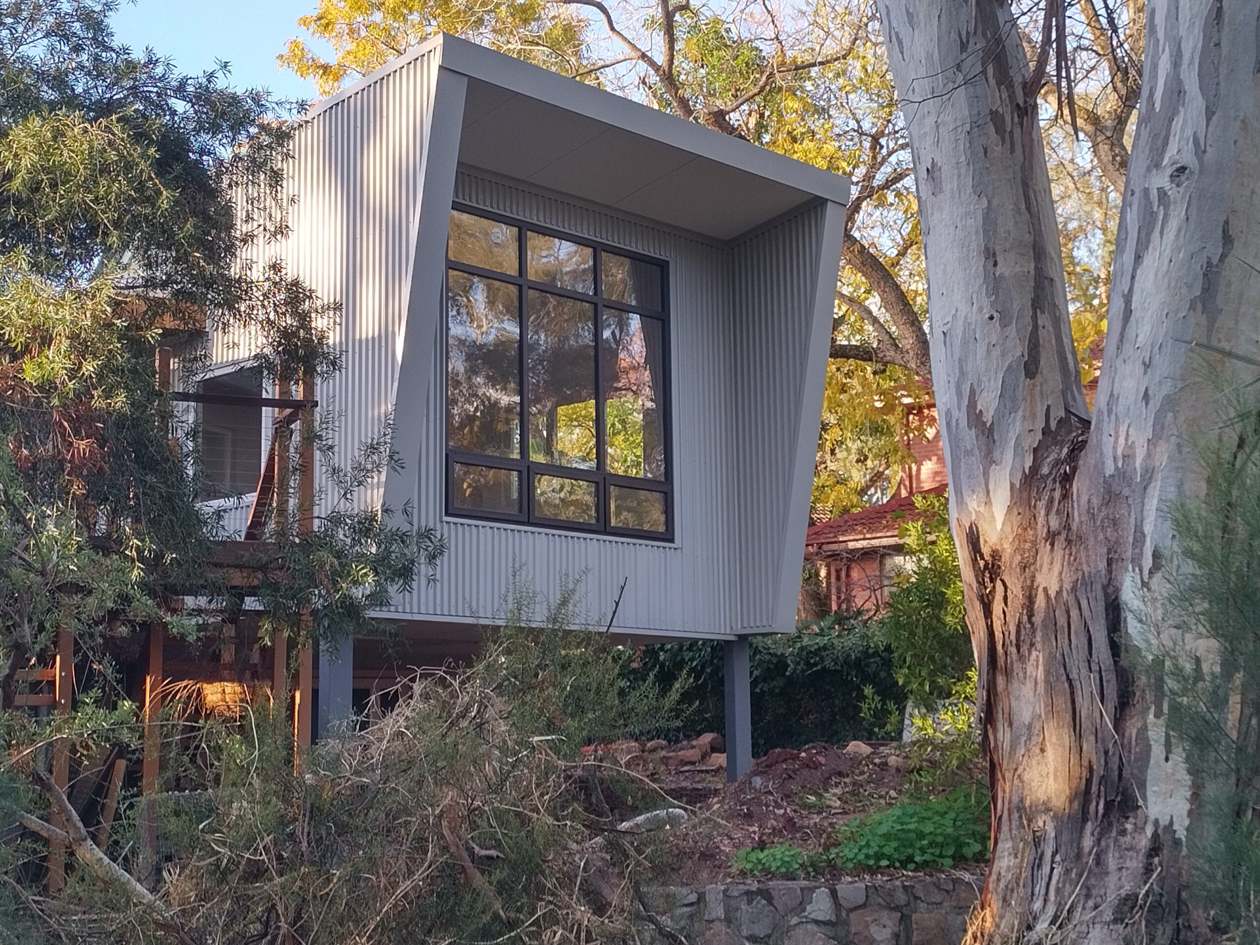 The middle level was demolished to allow subdivision of the block, with the two-storey bedroom section retained. A new living room and kitchen were added at the back to take advantage of the views of red gums in the adjacent creek reserve.