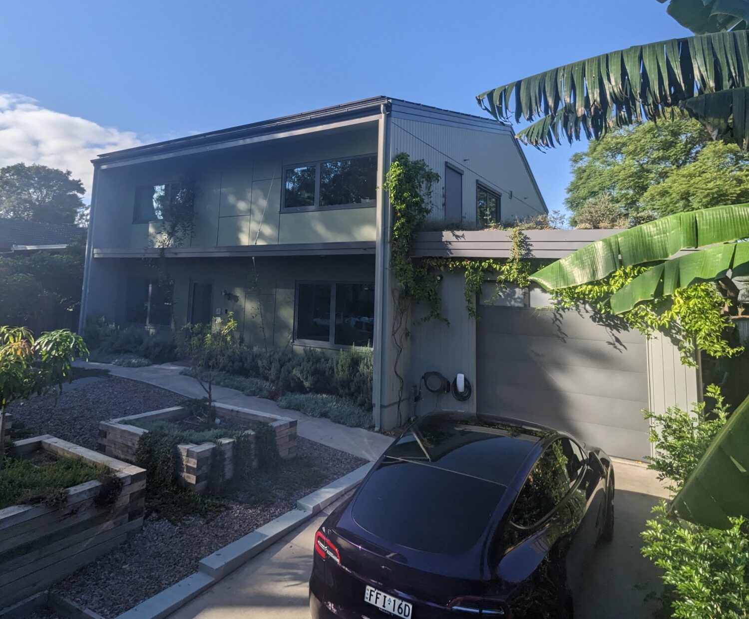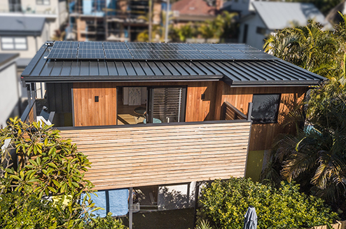 “Clearwind” is an all-electric family home built under a pre-existing hayshed. The huge roof confers advantages in fire protection, rain catchment and it is like living under a giant shady umbrella. The roof has been treated with Thermoshield, an albedo ceramic treatment which keeps the interior of the house at least 10 degrees cooler in summer.