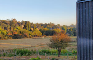 It faces north. The cladding and internal timbers are recycled. The insulation is double the usual thickness. The floor is a thermal mass of concrete, insulated underneath. It is all-electric, producing four times the electricity we use. Wastewater is processed by a worm farm and returns to the garden to grow fruits and summer green grass.