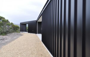 With 180m2 area including an insulated timber frame covered in ‘Firefly’ highly fire-resistant sarking, it rises from a concrete slab base. It has a simple skillion roof form that sheds burning embers. Its finished visually with dark colorbond metal cladding for a striking appearance.