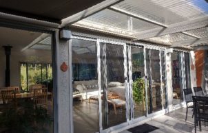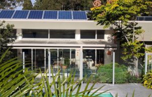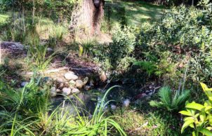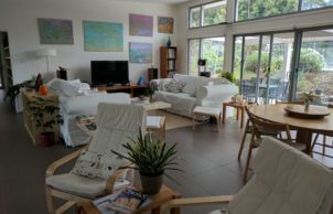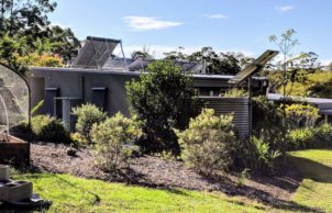 We built this home seven years ago with the goal of living more lightly on the land. We are a retired couple originally from Canberra where we raised our five kids in a solar passive house we built in 1994, with many low energy features. In this much smaller house on a much larger block, we are trying to live a more sustainable lifestyle. So this solar passive house has tiled floors, PV panels and solar hot water, rainwater harvesting, on-site treatment of all wastewater, slow combustion heating and excellent cross-ventilation design. It sits on two acres of fertile land that we are developing using permaculture principles such as organic pest control, recycling, water harvesting and management, a food forest and vegetable patch, newly created creeks and rainforest, and the regeneration of an existing stand of eucalyptus to create bird and wildlife habitat.