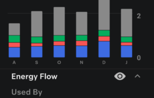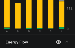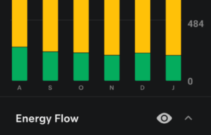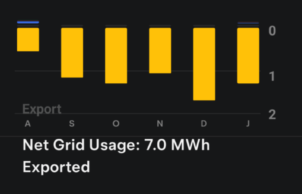 Being so efficient, and with a large solar array, the house generates more energy than it consumes, even accounting for charging our electric vehicle. Of the energy produced by the solar PV, 25% is used by the house directly during the day, 12% goes to the battery which powers the house overnight, and 8% is used for charging the car, with 55% being exported to the grid. Only about 3% of the power we use is drawn from the grid, everything else we need to power the house and charge the EV is supplied by the rooftop solar and battery.