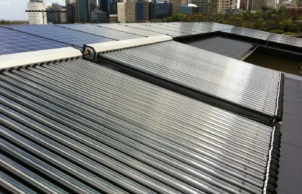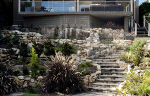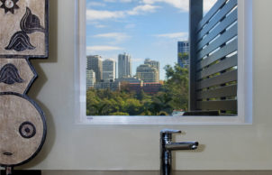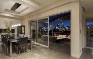 The Ritek roof, with an additional layer of Aircell insulation beneath (concealed above the raked ceilings), provides highly effective insulation (approx R6.5) whilst allowing large, unobstructed spans, opening up the living and dining space significantly and making the most of the sweeping city views. A cast concrete tank beneath the rear terrace captures all roof rainwater, providing use for all but drinking water.