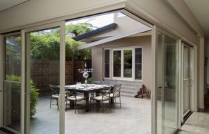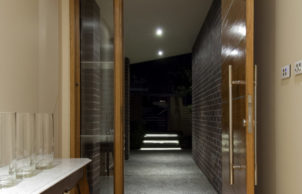 The old bungalow was deconstructed, not demolished. The face bricks were recycled from the original bungalow, and most of the common bricks were saved and reused in the ground-floor structure, then rendered. All brick cavity walls were insulated. The first floor is lightweight, using a rendered foam cladding system, which also provides part of the insulation. Some of the passive solar heating is captured in the concrete slab that is made accessible to the sun through the deep north-facing courtyard. The remainder of the northern aspect is shaded by a neighbouring building, and so solar hydronic heating is embedded in the slab. The double-glazed windows keep the heat in winter and, combined with effective shading, also keep it out in summer.