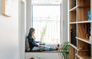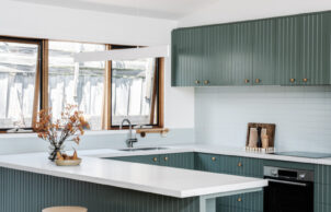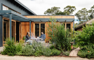 Nathan’s design was inspired by his experience drafting for prefab builders using light weight construction. Interior choices take their cue from nature with a blue-green toned palette offsetting neutral shades. Furnishings were purchased second-hand and from local designers to suit both budget needs and the owners’ sustainable ethos