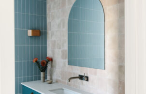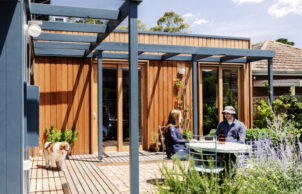 Located in Reservoir, Blueberry House, named for its’ blue exterior colour, is nestled at the back of a laneway, visible from the street as a line of blue against the backdrop of an impressive gumtree housed nearby. Draftsperson Nathan Burgess was given a unique opportunity by his volume builder employers (at the time) to create a sustainable, custom designed home. This allowed the owner couple, 30-somethings, Nathan and Jess, to build the first home that they own, after more than a decade of renting in Melbourne’s northern suburbs. A combination of government grants and a government low deposit lending scheme worked together to allow them to purchase the land and fund the build on a tight budget.