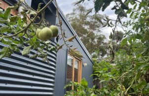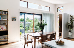 The house is 161 Sqm with 3 bedrooms, 1 bathroom, WC, ensuite, laundry and an open plan kitchen, meals and lounge area on 305Sqm of land. The L shape design is orientated so the open-plan living space and courtyard garden, where food and flowers are grown, benefit from northern exposure. Exposed awning and the beginnings of grape vines over the pergola to the deck allow for winter sun to warm and block the heat of the summer sun. Operable clerestory windows, awning windows, all double glazed, allow for cross flow ventilation and enhance the passive heating and cooling design. A 6000 litre water tank allows water retention and re-use for toilets and laundry. The home is all-electric, with a heat pump to boost hot water, electric oven and induction cooktop, powered by 6.00Kw solar panels. Solar panels were installed as part of Darebin’s Solar Saver Scheme which allowed the owners to install solar within their tight budget. Blueberry House uses the foundations of sustainable design, incorporating climate-appropriate design features to create a simple and modern home.