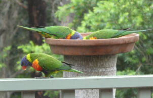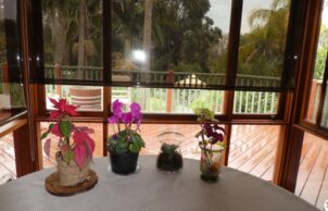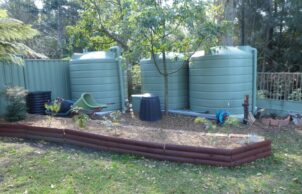 The gardens are mostly native plants/trees and edibles. Watering is via 3 × 5000L tanks, and there are various compost heaps and a worm farm. The adjacent bushland and creek were cleared of extensive weeds and regenerated with advice from Council Bushcare.