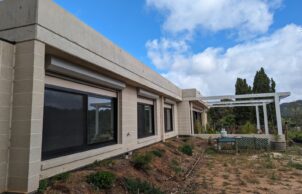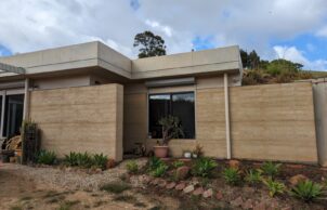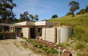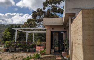 ShelterSpace believes that a properly designed earth-sheltered house is the most bushfire-resistant house available today because the concrete walls and roof are protected by earth with only one facade exposed – and this is where you focus all the fire defence. The lack of conventional roof space means there is no possibility of embers entering through the roof – one of the main ways traditional houses ignite and burn during bushfires. Earth-sheltered houses have thermal comfort benefits, generally maintaining an internal temperature of between 15 and 25 degrees Celsius without any need for air conditioning and minimum heating. The house is cut into a northeast facing slope for a favourable solar orientation. Stefan & Emrys wanted to add natural elements into the building and achieved this using recycled timber flooring and feature rammed earth walls.