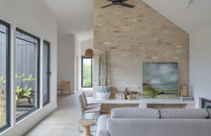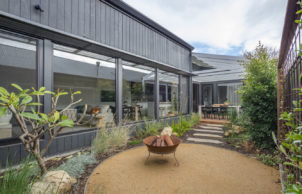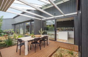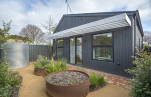 A combination of lightweight external cladding (Shadowclad) plus reverse brick veneer and polished concrete floors gives a good amount of thermal mass and high efficiency electric appliances help dramatically reduce running costs when compared to an average home. The house also has an air tightness level of 4.75 ACH50 (independently tested) and inlcludes LED downlights, ceiling fans & low/zero VOC finishes throughout.