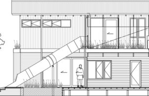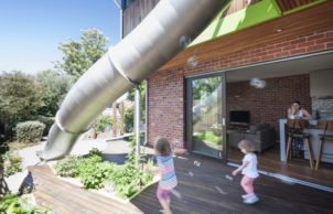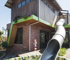 Set back at ground level to provide space for an outdoor deck connected to the living zone, the upstairs bedroom opens onto a large balcony with views back over the old house and a slide down to a sandpit in the garden.