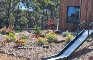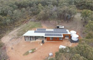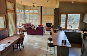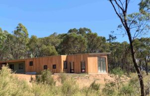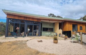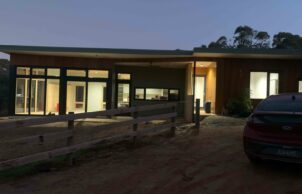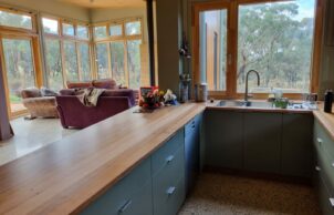 Cooee Park is a solar passive house, situated on 36ha of conservation covenanted land on Taungurung Country. The house is off-grid, with composting toilets, tank water and solar power that supports an EV. It features 140mm timber walls, an insulated concrete slab, all-electric appliances, double-glazed, tilt-and-turn windows and wide eaves to the North. Heating is from an Ethos wood fireplace and cooling is via passive design and ceiling fans. With a BAL 29 fire rating, it also includes a roof sprinkler system.