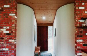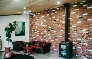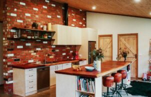 The house features burnished concrete floors and a recycled red brick internal wall for thermal mass. All the finishes inside the home are natural and low or zero VOC. It was important for the owners to build a home that was healthy for their young family, the use of clay render inside the home helps to filter and purify the internal air. The house is situated on two acres that is slowly being covered in fruit trees, a veggie garden and a chook run, edible and native gardens and lots of trees.