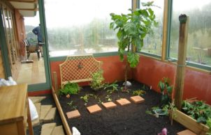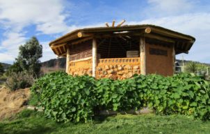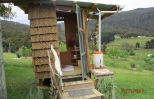 Cross ventilation provides cooling plus there is a cooling system in the pantry that uses cool ducted air from a fernery outside. The greenhouse, with direct access to the kitchen allows for the freshest herbs and vegetables when cooking. Besides conventional WC’s in the house, there is also a composting WC outside with fantastic views of the mountains. The waste from this WC is turned into humanure which is then used in the orchard. Most recent addition to the property is an entertainment area built from natural materials from the property, including a pizza oven built of clay, thatch roof and clay, wattle and bottle walls.