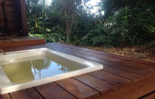 The home features an outdoor shower and Japanese bath, providing views to lush greenery and freedom from the need for tiles, grout and cleaning. A second indoor bathroom uses INEX boards instead of wall tiles to again reduce cleaning.