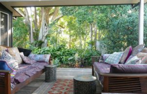 A 150-year-old Strangler Fig was the inspiration for the interior designer owner to build on this 1200m2 block in Bangalow. The tree is used as a natural shading device in summer, while providing a wonderful sense of privacy and welcome haven for wildlife. Echidnas, possums, snakes and many birds enjoy the large and graceful fig tree and subtropical garden underneath.