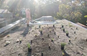 The garden is all native and includes several large rocky riverbeds with a large rain garden that collects and filters excessive rainwater runoff during heavy rain events.