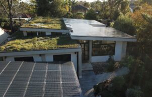 Featuring double-glazed windows, 66 solar panels on the house and 24 semi-transparent solar panels integrated into the carport, (29.90kw total) In-roof solar systems eliminate the need for any traditional roofing materials by using the standard size PV panels itself as roof finish. This innovative in-roof system, the largest of its kind in Australia, is complemented by a 9kw solar thermal system with an 800-liter hot water storage tank, a 15kw battery, and a 12kw air-to-water heat pump. This powerful combination enables solar-powered hydroponic floor heating or cooling all year around, eliminating the need for gas or air-conditioning. A 40,000-liter rainwater tank supports water sustainability. The 190m² green roof is one of Australia’s largest residential green roofs installations. It can hold up to 4000 litres of rainwater in its storage layers. The inverted green roof, with a special insulation board on top of waterproofed concrete structure keeps the house cool and warm. The carport is currently awaiting the installation of an electric vehicle charger. The house is very air tide. All doors are fully framed no gaps under external doors. A decentralized ventilation system with heat recovery is installed.