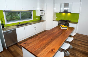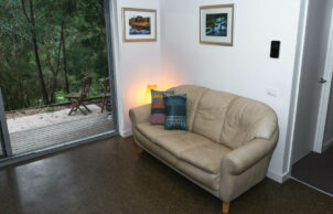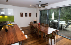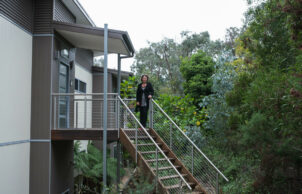 Janine’s passive solar home features an exposed concrete slab facing northwest, narrow build to increase air exchange, awning and sliding double-glazed windows on opposite walls for air flow. All living and bedrooms have two-way ceiling fans for winter and summer settings.
