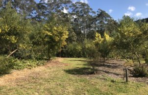 The garden is water wise with the transpiration area for the septic distributed around the garden via underwater drip feed. Permaculture principles are incorporated by using native plants along the water catching swales to fix the Nitrogen from the air and return it to the soil. Our 2 year old orchard is a mixture of fruit trees such as oranges, pomegranate, apple, lemons, etc and edible ground covers like sweet potato.