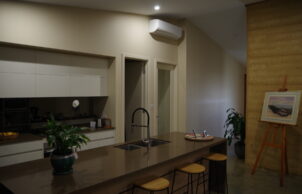 A single 6kW split system can be used for heating if prolonged cold weather requires it. The Split System use can be limited to daytime when some solar power is available. However, we have found that if the sun is out the house gains warmth anyway, and extra heating is rarely needed. Conversely when heat really is needed, it is when there has been no sun for days. However with solar feed in tariffs falling very low, it makes sense to use some of that power to run the AC to top up the heat storage anyway. Despite occasional cold snaps during Spring, supplementary heating isn’t needed from the end of August through to June. The sunroom and outside blind can be adjusted to allow sunlight and warmth at any time of the year.