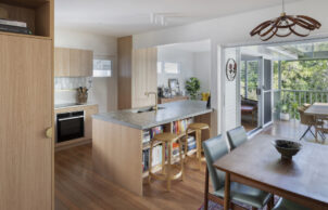 One of the biggest transformations was opening up the kitchen, dining, and living areas, removing a rear sunroom to create a generous outdoor room and abundant breezes through the home. This new space blurs the boundary between indoors and out, optimizing cross-ventilation and natural light. A green-hued timber batten balustrade allows the deck to recede into the surrounding parkland, preserving privacy and enhancing the home’s connection to nature.