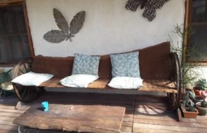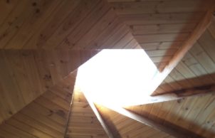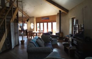 HayDaze is built with straw bales in a octagonal shape with recipricol roof. Both load bearing, post and beam construction with mezzanine upstairs that overlooks the ground floor. There is a heat exchange ventilation system to keep temperatures constant.