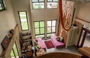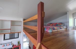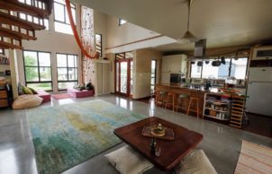 Our family likes to live simple, having less things around the home allows room for creativity and inspiration. The rooms in our home have been designed to be multipurpose. We sleep on Tatami and Futons from Zentai so that they can be easily packed away to transform the space for work, dance or yoga. We don’t have a TV or a couch, instead we have a large rug and cushions so that the open space can be transformed easily into a family room, dining room or entertaining room. We eat at a low, Japanese inspired recycled Jarrah table so that we don’t need chairs. Our house has a Climbing Wall and a Circus Silk so that we can enjoy exercise within our home. We don’t have a laundry room and instead have a laundry closet space.
