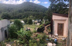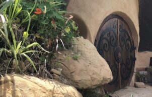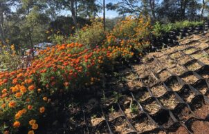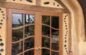 The sustainable features of the art studio include 1) natural materals such as double super-adobe walls (earth tubes with barbed wire on top) to withstand earthquakes and deter ember attack in case of bushfires 2) external walls faced with rock and vertical gardens 3) earth floors 4) green roof with a variety of hardy plants.