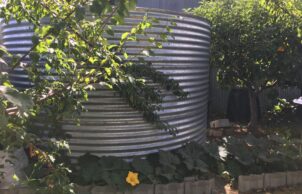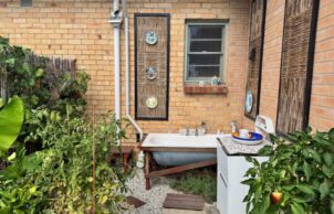 The front grassed area has been completely transformed to a native garden with a pond to attract wildlife. The rear garden is focused on food production and a play space for visiting children. An outdoor bath area has been created. A large corrugated iron water tank collects water from both the house and shed.