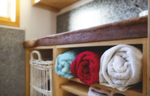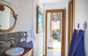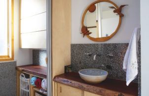 Recycled products that Bob (the owner) saved for years were used to create a natural and very organic feel of the build, including recycled timber benchtops built by Bob and recycled doors, hinges and handles. In the bathroom, old tiles were reused and created a look that compliments the home so well.