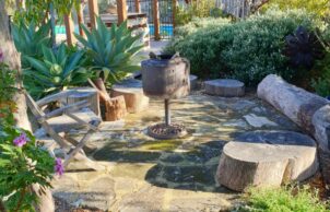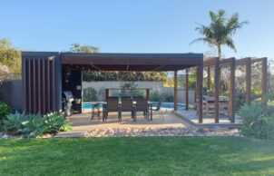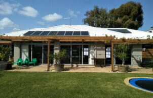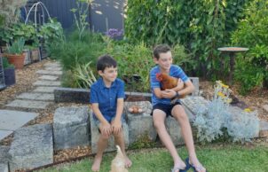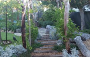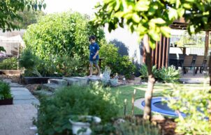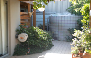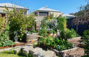 We have a large productive garden that includes multiple fruit trees, bush food, seasonal vegetables, herbs and native plants. We practice permaculture principles including composting, worm farms, mulching, and chickens. As we believe in reducing landfill, many landscaping and garden features were made out of salvaged or reclaimed items. Deciduous fruiting grapevines are trained along the pergolas providing summer shade, then allowing winter sun to penetrate the house and warm up the floor tiles providing warmth.