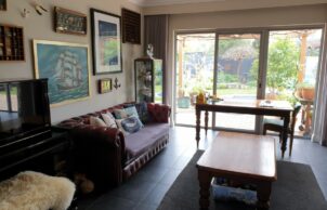 The water tank provides water to the toilets and washing machine. Solar panels and solar hot water are included. All appliances, fittings, finishes and furniture were considered for their eco credentials. Decorating and furniture is often vintage to go with the sustainable theme.