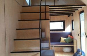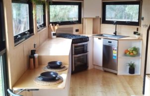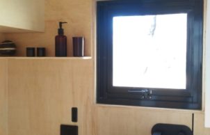 Designed for northern orientation, the home features double glazing and high-performance insulation throughout. A thermal break layer limits heating of the steel frame, and underfloor insulation is completely sealed. Exclusive use of LED lighting ensures a minimal load on the standalone system and a modern ‘no fuss’ composting toilet is installed with scope for greywater treatment/recycling. Water is heated by an efficient Bosch instant LPG system that uses water pressure for its ignition, and rainwater catchment is made possible by the installation of fascias around the roof’s perimeter. Liberté has been designed to be a completely autonomous housing solution that relies almost entirely on nature’s daily offerings for its full functionality as a small, modern home.