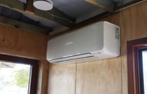 There are none of the typical problems of a normal house.  There are no air leaks, it is super insulated to prevent heat losses and gains, has 100% fresh air using heat recovery to help maintain a comfortable temperature, with no mould or condensation on any surface, and is dust and insect free.  Any emissions from materials, food, or humans are continually exhausted. A tiny backup reverse cycle air conditioner (1.5kW consumption) is sufficient to deal with any extreme conditions such as a heat wave or large numbers of visitors.