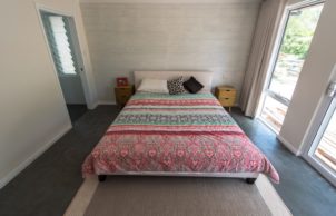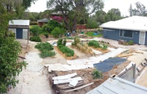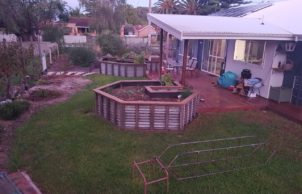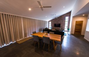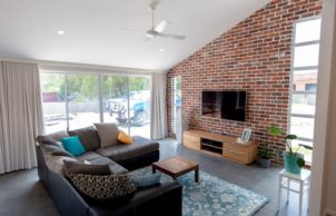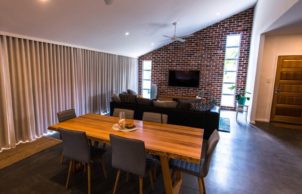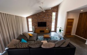 Our favourite part of the house is the interaction with the garden and home, this was design using permaculture practices. Recreation, study, security, food harvesting and native viewing are designed to be accessible and integrate with the living area. Our Grandad built the original fibro house on the block and my mum was born here, it was only by coincidence that we bought the house back into the family. We were able to repurpose and incorporate materials from the old house into the build, the decking area is built using the old jarrah framing, feature jarrah floorboard walls and an internal brick wall showcasing a brick etched with the words from an unknown author ‘I am mad’.