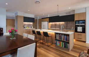 We had searched for years for an energy efficient house and realised that we needed to build it ourselves. As we planned the build, we also realised it needed to provide a healthy environment, a quiet, calm space, be resilient, cater to our future ageing needs and importantly it needed to fit onto a tiny 380m2 block. The best solution for most of these criteria was to build a Passive House. The liveable area of the house is about 145m2. Even though the size is small, the house retains a feeling of space and light due to clever use of open areas, high windows and ceilings and large circulation spaces.