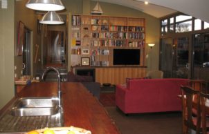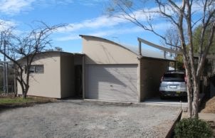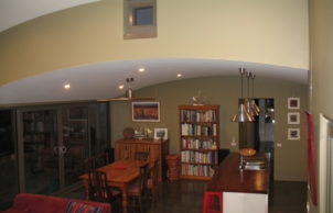 Strine’s classic and unbeatably energy efficient Millennium portfolio concept has been adapted as a split level design, with integrated garage, carport, north pergola and south verandah. The sculptural curved “wave” roof forms add visual impact and dynamic street appeal. This is a functional, minimalist, modern design with two separate bedroom areas zoned either side of the open plan Living/Dining/ Kitchen. The light-filled central hub of the house integrates seamlessly with the outdoor areas to the North and South through large sliding glass doors. The highly insulated building envelope and concrete internal thermal mass ensure that this house needs no cooling in summer and almost no heating in winter.