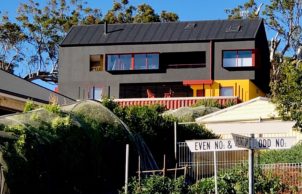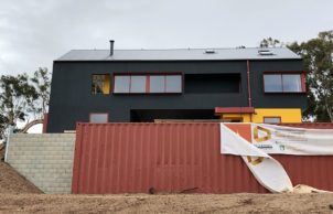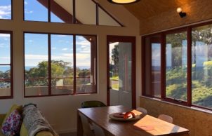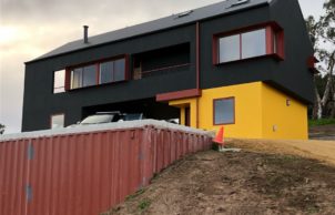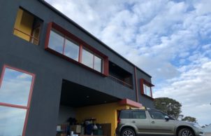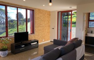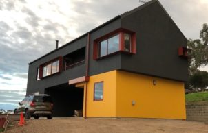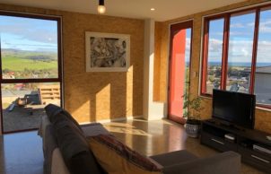 A freshly completed, compact, two-storey open-plan house + studio, with rural and sea views. This house is part of my evolving interest in designing and creating sustainable lifestyles (for myself and for others). Although very different to the first house I built – a strawbale house (which pushed the boundaries of traditional strawbale) in regional Victoria, this house represents something of a twist on the average domicile. My aspirations for this dwelling was to emulate the form of a ‘typical’, modern domestic house and channel sustainable elements into such as solar passive orientation, an efficient thermal envelope and highly efficient and quality components, such that it represents ‘good value’ whilst appealing to the ‘average punter’.