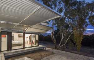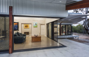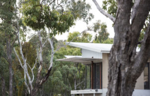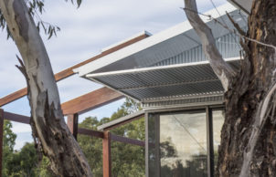 A simple system of ropes and pulleys operates the fire shutters that shield the exposed western end of the building. Although not designated as bushfire proof, the shutters are a sensible precaution for that ever-present risk. They double as solar shading to the western glazing and, if closed at night, provide protection in addition to that of the thermally improved aluminium frames and double glazing.