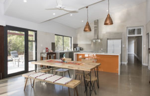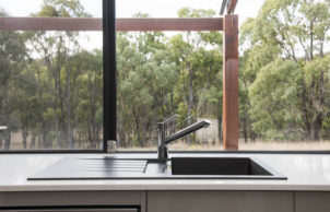 The ceiling of the dining room conceals the working mechanisms of the warm air transfer system, a series of off-the-shelf fans and ducts that pull heat from directly above the slow combustion stove and deliver it to the bedrooms. This system negates the need for any other heating systems beyond the sun and fallen timber that needs to be gathered for bushfire safety.