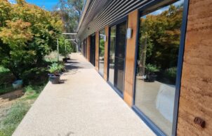 With self sufficiency foremost in our minds, we set out to build a low impact high efficiency passive solar home for our family. Built in 2 stages, we moved in in 2008, and presently the 2nd stage is nearing completion. The only outside connections to society are phones and NBN. Rainwater is collected into a 150 kl tank supplemented by a bore as needed. Power is home made with 5.6 kW solar and 54 kW of batteries. Waste is consumed in our “worm” septic and used to irrigate the home orchard. The property uses permaculture principals and land regeneration to encourage biodiversity.