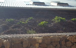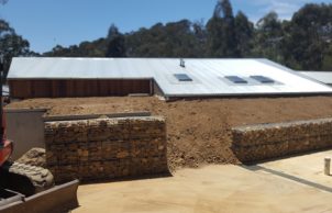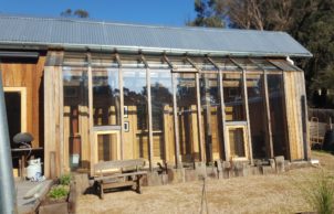 Our home is earth ship inspired. A greenhouse is situated on the northern face of the house providing access to the bedrooms and bathroom. The sun heats this space, drawing the warm ceiling air through the earth berm to the south. Over time the earth berm will gradually warm to a constant temperature of 21-23 degrees C all year round. This then radiates to the internal spaces. Soil excavated was used to create an earth berm to the southern side of the house and earth bag foundations.