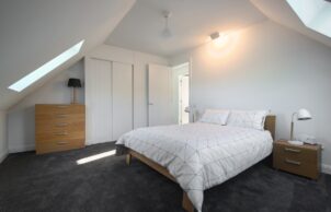 The upstairs bedrooms and bathroom feature raking ceilings with skylights for natural lighting and stargazing into the night sky. The west-facing windows are protected by external plantation shutter-style louvres, fully openable in winter.