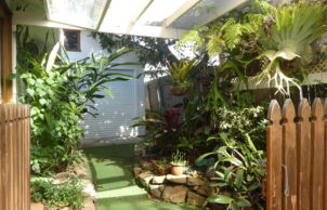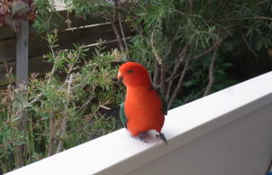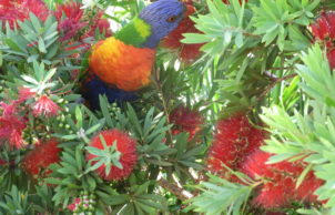 Our garden includes decaying hollow logs for lizards, a frog pond and nestboxes for possums and micro bats. Brushtailed and ringtailed possums are here and the flowers of our neighbour’s overhanging Camellia are a favourite for both ringtailed possums and King parrots …. so this non-native plant has special status. Many of the species planted are local to NSW, but the garden also includes quite a few plants from Western Australia including Kangaroo Paws which are a favourite with honeyeaters.