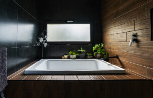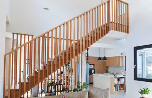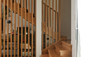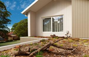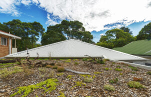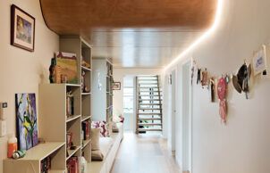 The elongated plan of the home is connected by an extensive green roof between the two gable forms, a response to the traditions of the area, while balancing the geometric challenges of steeply pitched roofs and self-shading. These roofs are organised internally underneath a curving plywood ceiling that draws the visitor towards the rear of the home.
