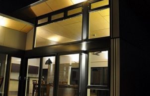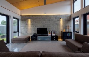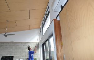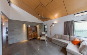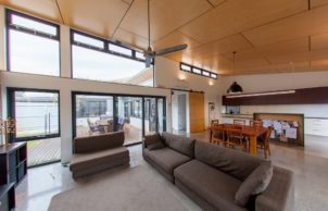 The windows are double-glazed with UPVC frames to all windows except corner windows, which are 12mm single-glazed with clear low-e. Kingspan Aircell insulation wraps the building. Plywood is used as a ceiling lining, with expressed shadow joints extending out to soffit.
